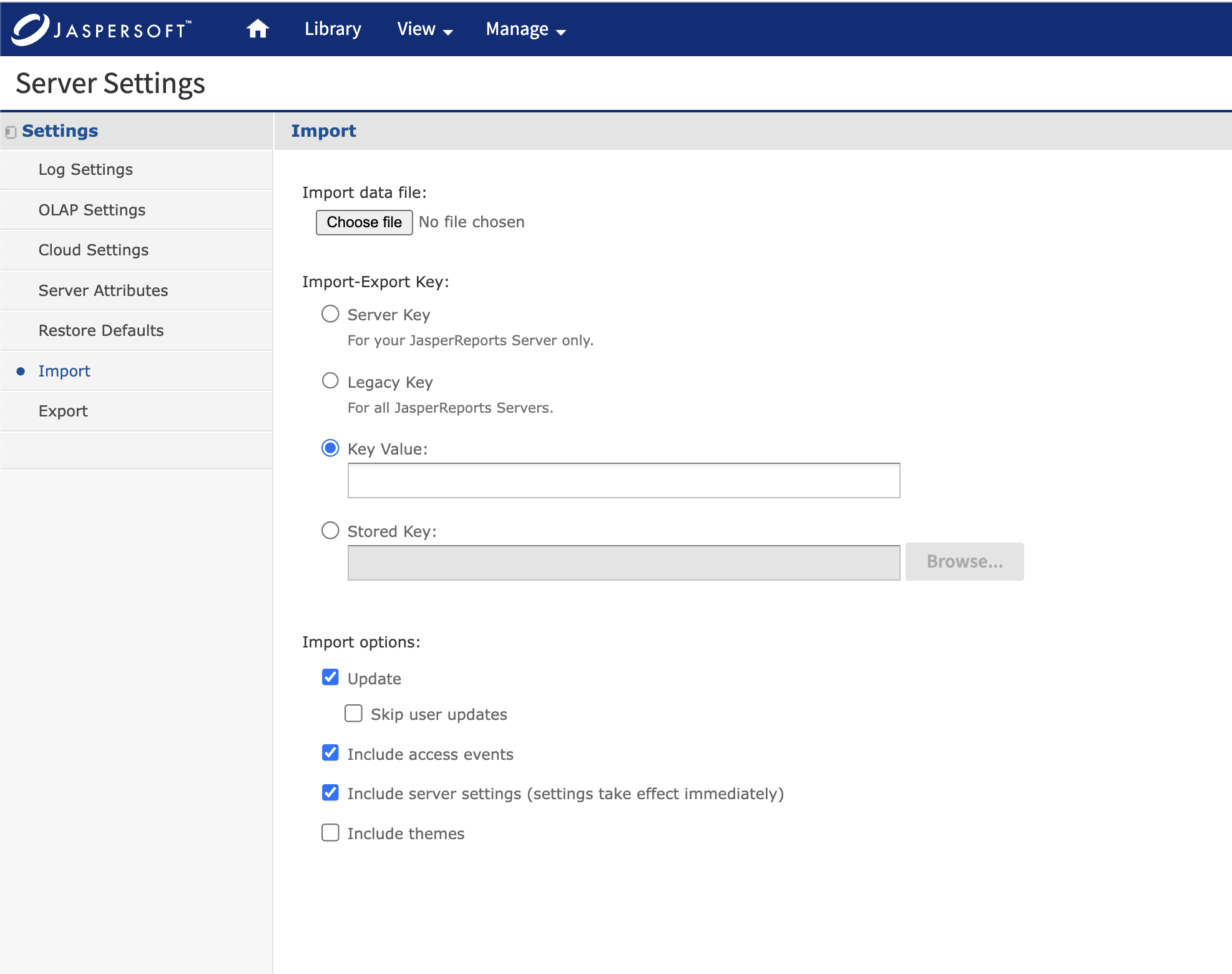Import the zip file in target jasper using the "Key Value" option by specifying the key value "<specify_key_value>" used during export.